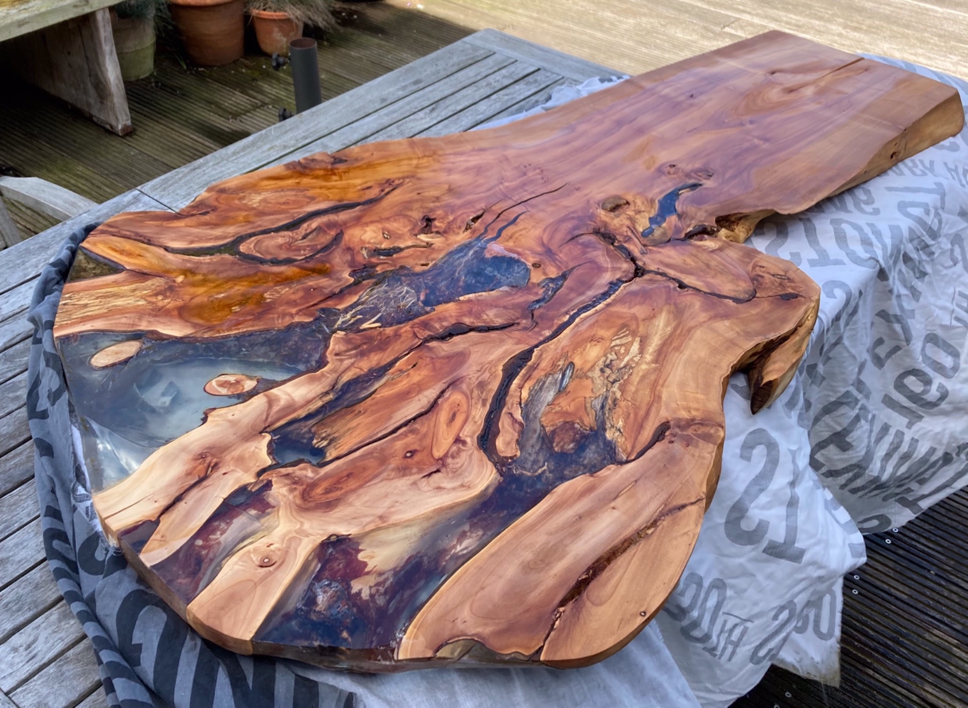 knotwilgtafel met epoxy, van de zijkant van de knot. grootte: 120x80cm