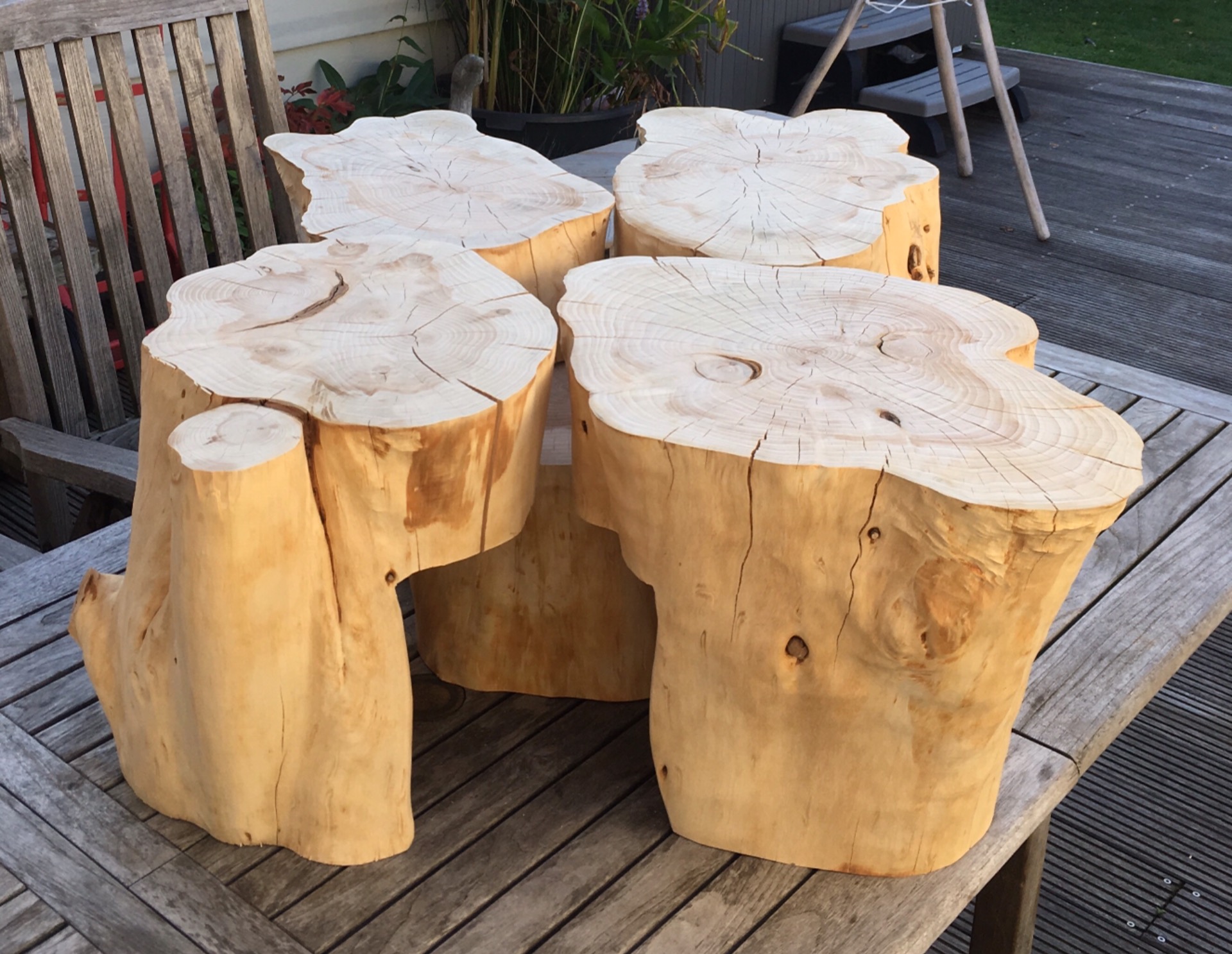 vierdelige tafel uit conifeerstammen. de bomen moesten weg omdat het te gevaarlijk werd op de school.