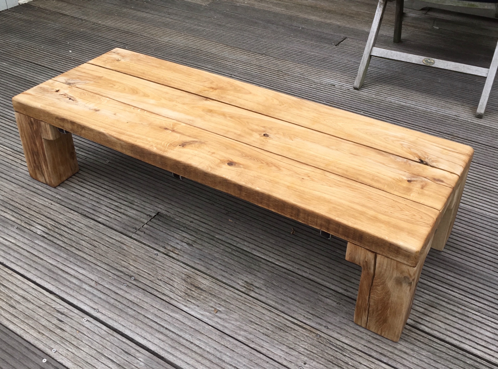 tafel uit gerecupereerde eiken balken uit woning van de buren.