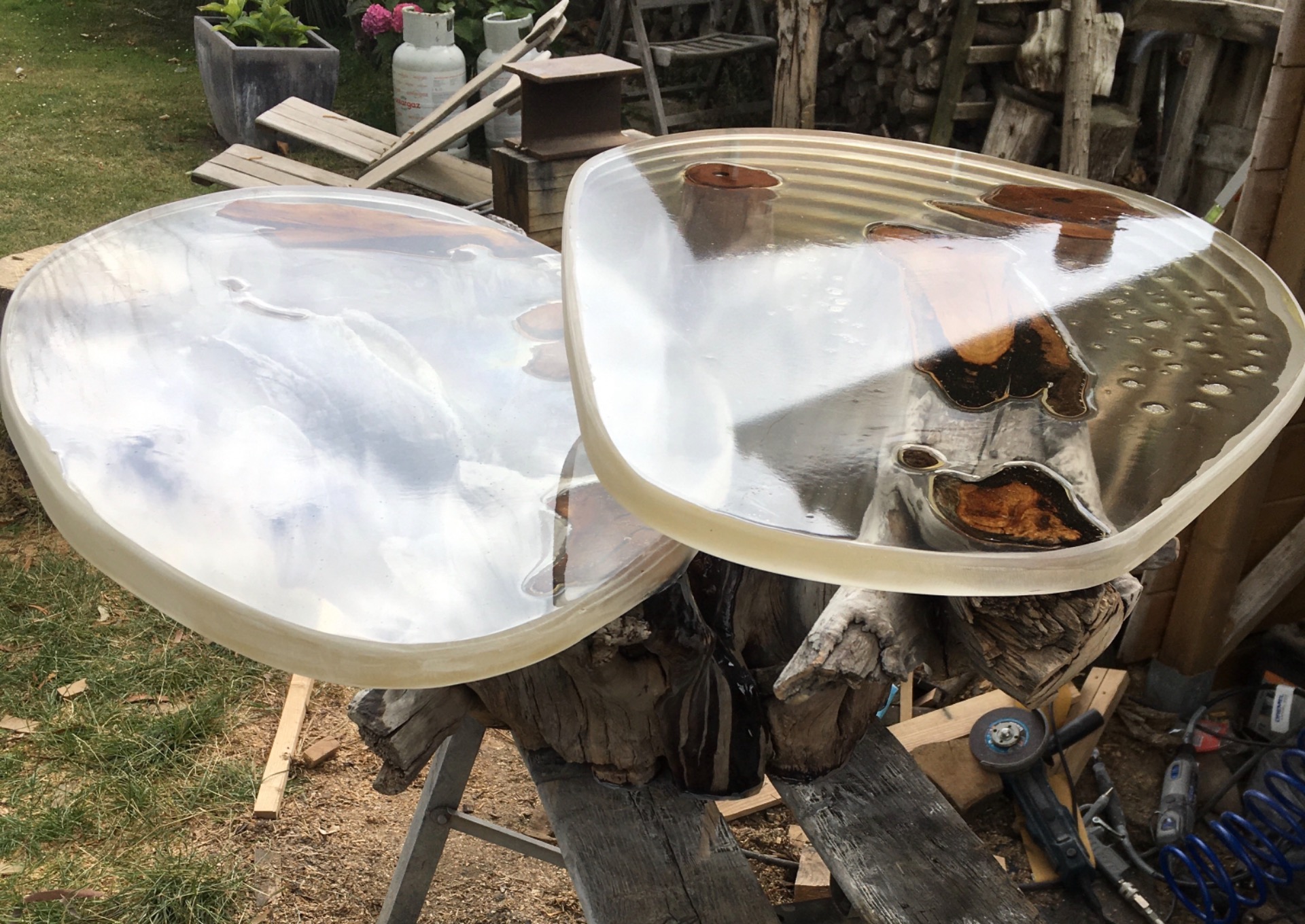 wortel van kerselaar die gebruikt is als voet voor tafeltje met epoxy bladen.